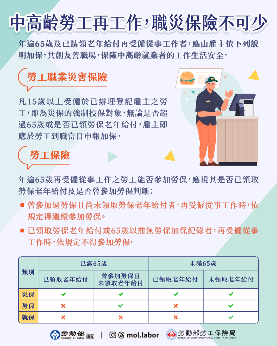 勞動部強調,雇主務必依規定為勞工投保災保,不因年齡或已領取退休給付而有例外。雇主除了應確實依規定為勞工辦理災保,也可同時為符合前述勞保加保條件之高齡勞工申報參加勞保,提供更全面的保障,讓勞工能安心發揮所長,共同打造安全、友善、包容的職場環境。