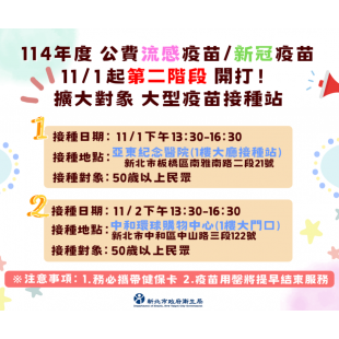 因11月1日擴大對象開放日適逢假日及白沙屯媽祖贊境,新北市政府衛生局特別在11月1日(星期六)下午於亞東紀念醫院1樓大廳及11月2日(星期日)下午於中和環球購物中心設置疫苗接種站,提供民眾免費接種流感及新冠疫苗;另為提升接種便利性, 11月共設立313場社區接種站,提醒符合疫苗資格的市民攜帶健保卡踴躍前往接種,共同守護健康;詳細接種站位置及開放時間可至新北市衛生局網站查詢(網址:https://www.health.ntpc.gov.tw/)。