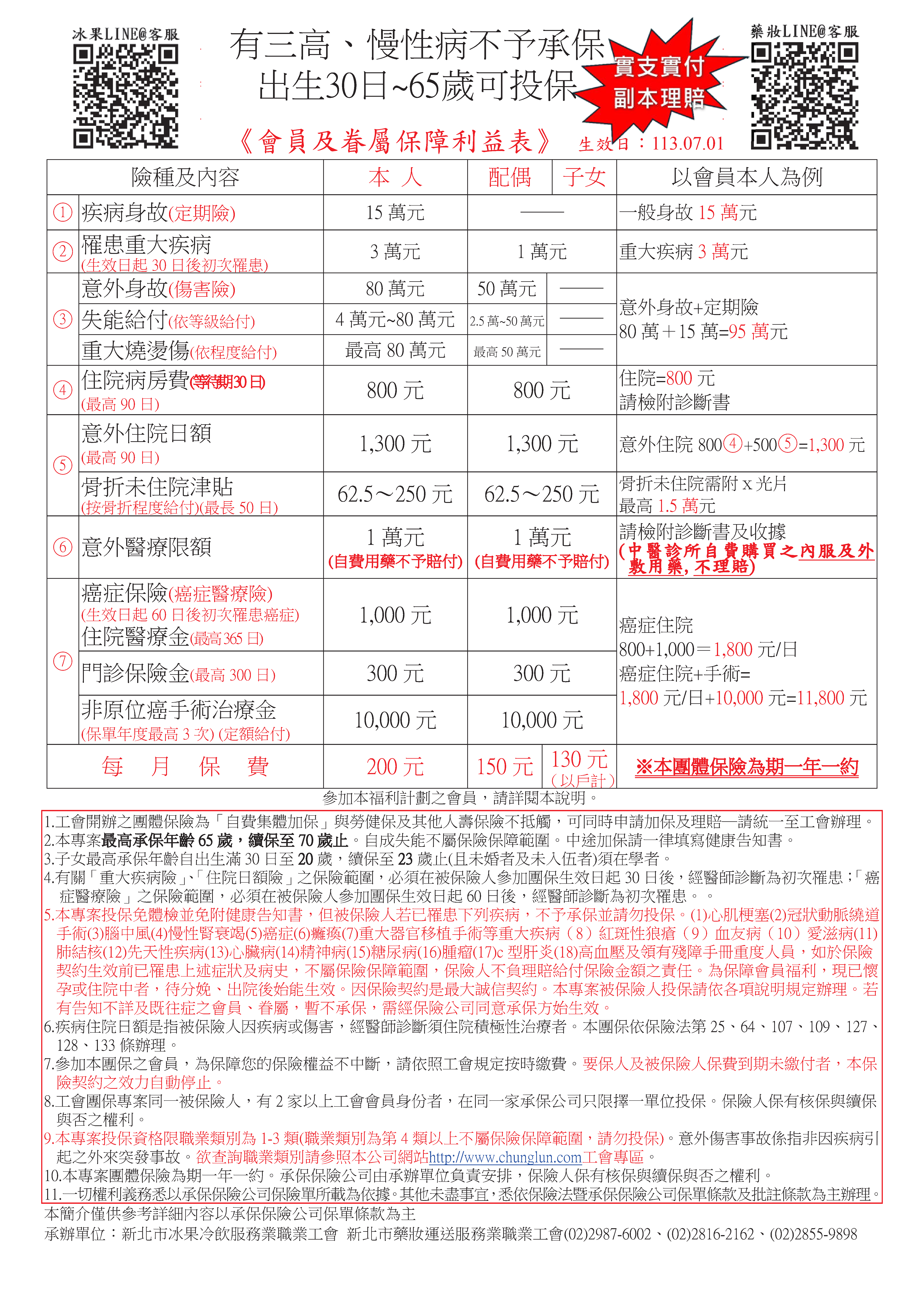 團保A:傷病團保(含疾病.意外.癌症)團保保障利益表1130701生效(收據副本可申請)